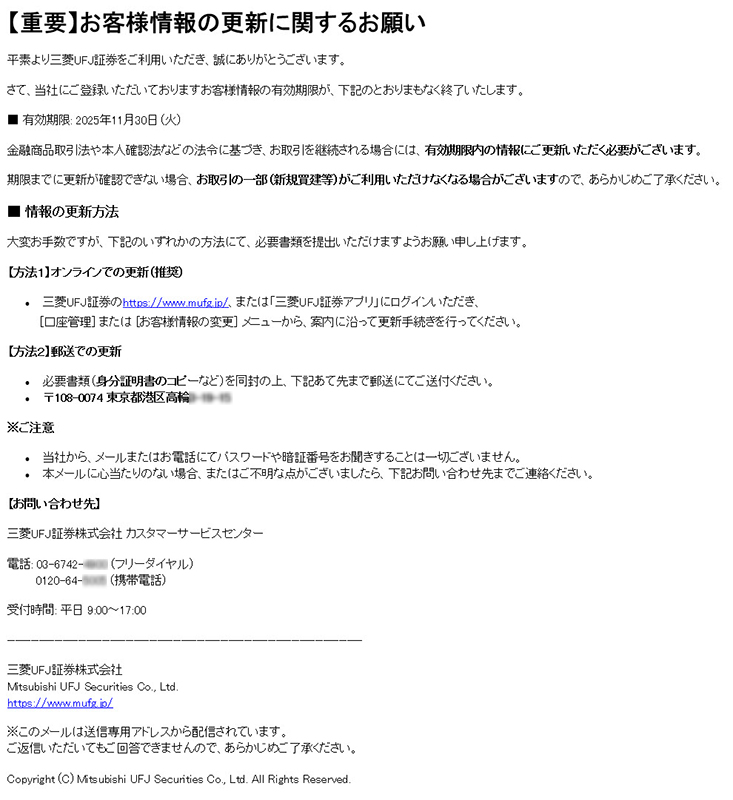 11月25日(火)に、新たなフィッシング詐欺メールを複数確認しています。フィッシング詐欺メールの文面にある当社のサイトを騙ったリンクをおすと、当社のログインページを模したフィッシングサイトにリンクいたします。十分ご注意ください。
