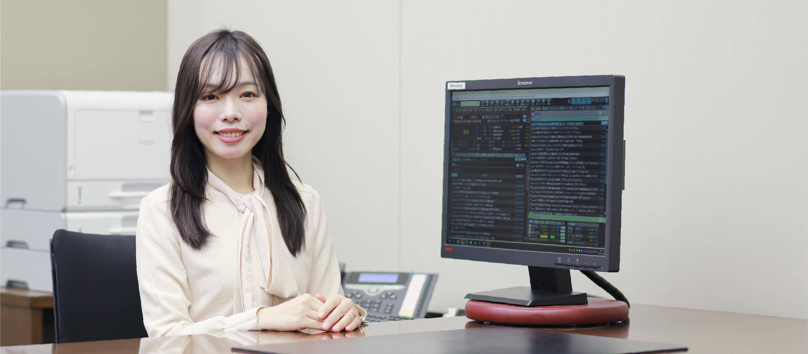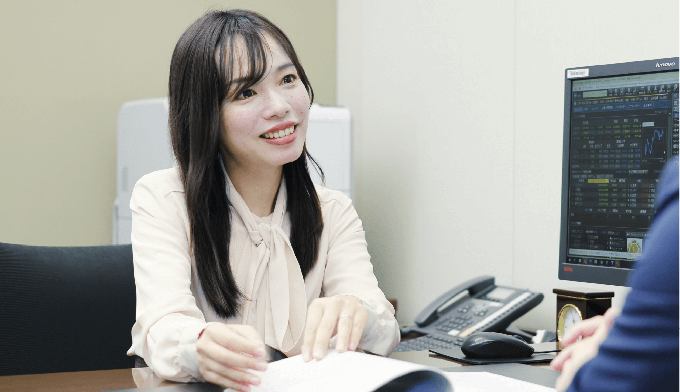 私は現在、アソシエイト(本支店サポート業務の社内名称)として、お客さま担当者が効率的に業務を遂行できるようサポートをしています。お客さまからの問い合わせへの回答や、事務手続きの補助、データの編集、各種資料作成など、アソシエイトの業務は多岐に渡ります。所属している支店は、約90人のお客さま担当者が在籍しており、経験値等それぞれ異なる為、各人に合わせたサポートを心がけています。また、アソシエイトには、保有商品の情報や市況、株式市場の動向など、専門的な知識も必要です。お客さまの質問の意図を正確に汲み取りながら、丁寧に対応し、結果、顧客満足度の向上や大きな商談に繋がった際は、アソシエイト冥利に尽きますね。