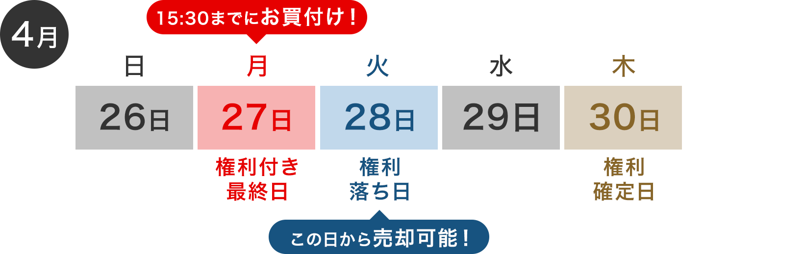 配当金を受取るには、権利確定日に株主名簿に株主として記載されることが必要です。そのためには、権利確定日を含め3営業日前の権利付き最終日までに株式を購入していなくてはいけません。同月の権利落ち日以降(権利付き最終日の翌営業日)であれば売却しても配当金を受取ることが可能ですが、予想配当額は今後増減し、無配になる可能性もありますのでご留意ください。