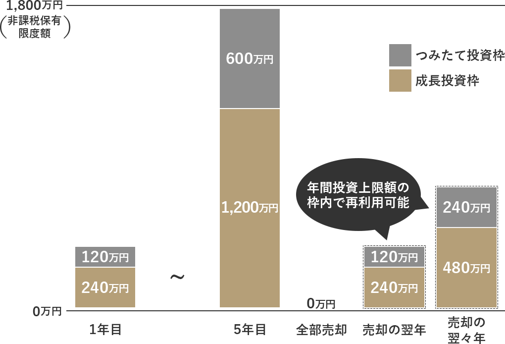 投資額の一部または全部を売却した場合、非課税保有限度額は翌年以降に再利用可能となります。ただし、年間投資上限額を超えて再利用することはできません。