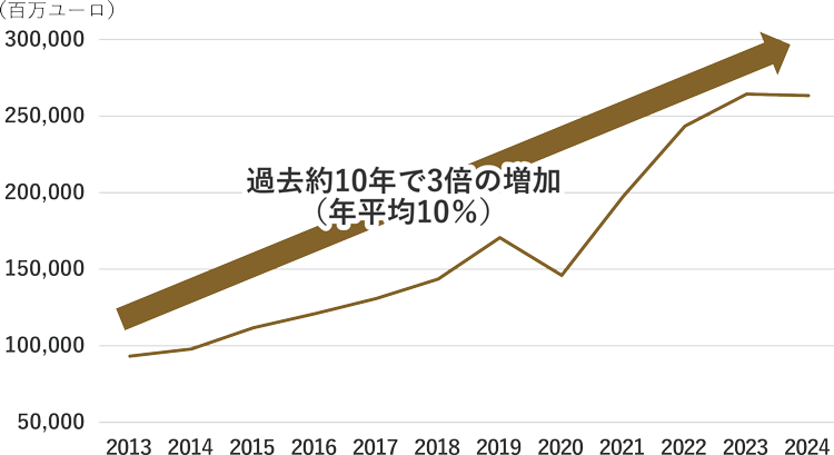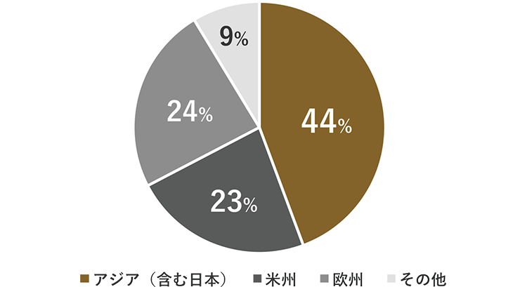 ヨーロッパのラグジュアリー企業10社の売上高はコロナ禍において一時減少していましたが、近年増加傾向にあり、2013年~2024年では売上高が約3倍に増加しました。地域別ではアジアの比率が高く、企業の成長をけん引しています。