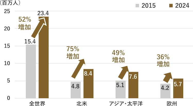 中国・インドを中心とするアジア地域の経済成長により、世界の富裕層人口は2015年~2024年に約800万人増加しています。富裕層を中心とする高級ブランド商品の消費が増加することにより、対象企業の業績の中長期的な拡大が期待できます。