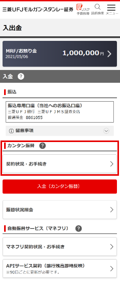 「カンタン振替」はオンライントレード画面上の操作より、三菱UFJ銀行の預金口座からリアルタイムでご指定の金額を引落とし、当社のお客さま口座へご入金いただく口座振替サービスです。