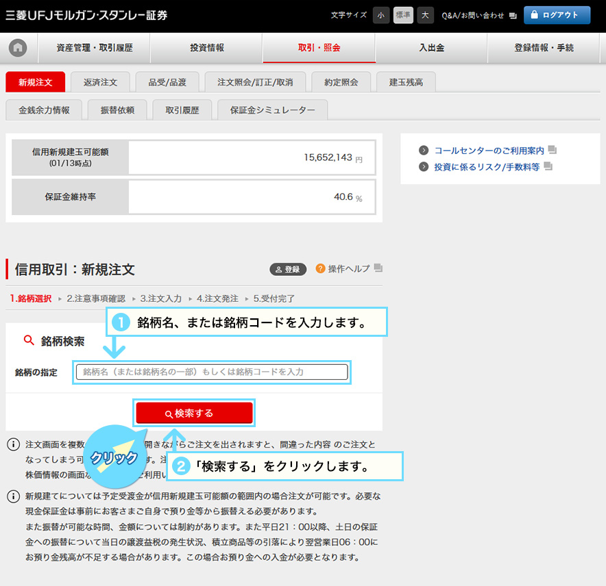 インターネットトレード デモ画面: 信用取引: 新規注文