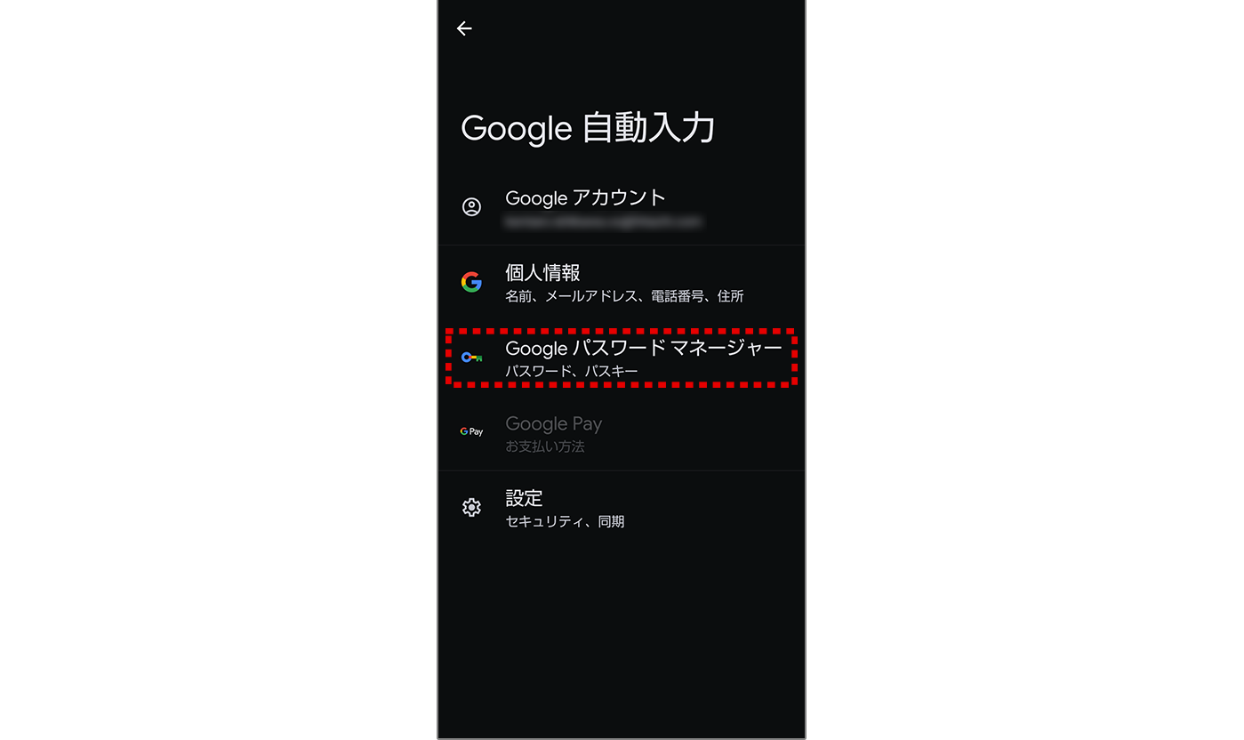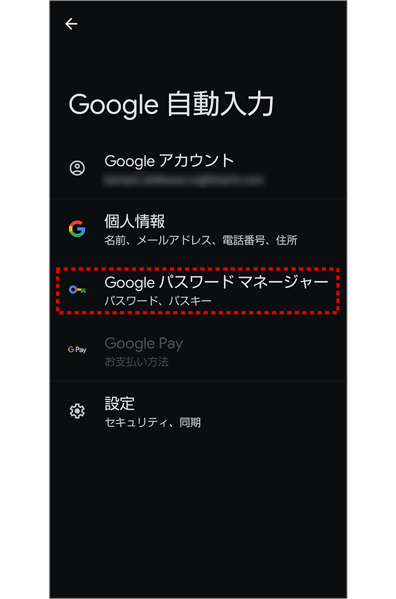 パスワードと自動入力で【Google】と表示される機種もあります。